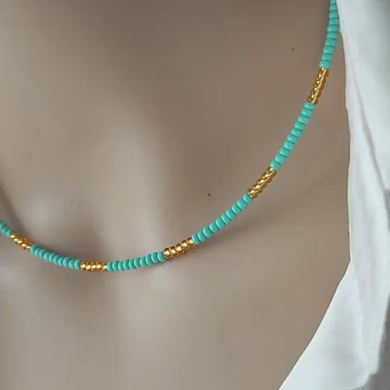 Add a touch of boho elegance to your look with this handcrafted turquoise and gold seed beads choker. Made with high-quality glass seed beads, this delicate piece features a vibrant combination of turquoise blue and metallic gold — a timeless blend that suits any season.